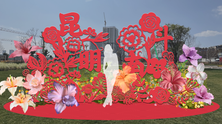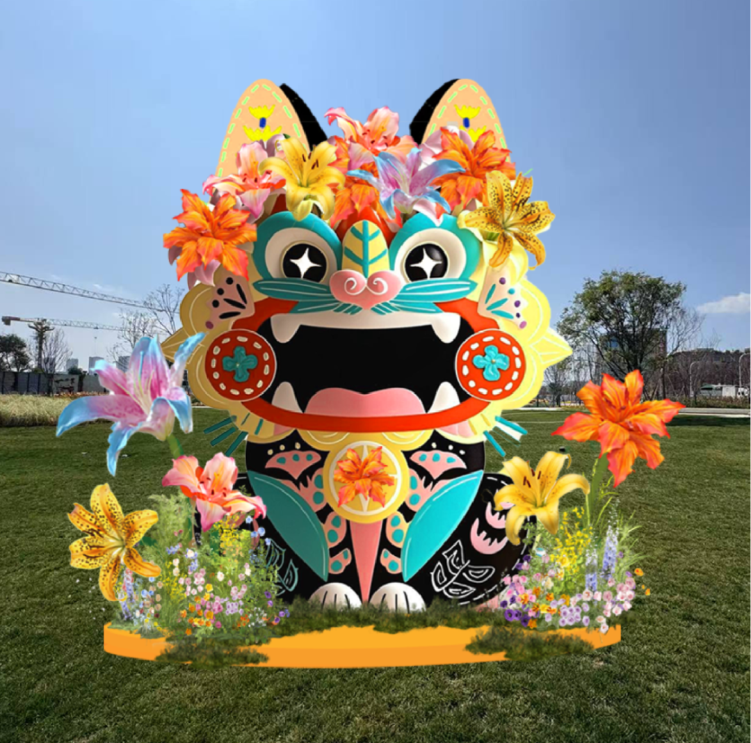 装置内容:联合呈贡非遗传承人及艺术家,以菱角编织、剪纸、瓦猫为基底创作兼具打卡与文化传播功能的花植装置。通过 "花卉+艺术+非遗" 的创新融合,推动呈贡从“花卉交易中心”向“文化创意高地”转型,赋能春城花都文化活力。