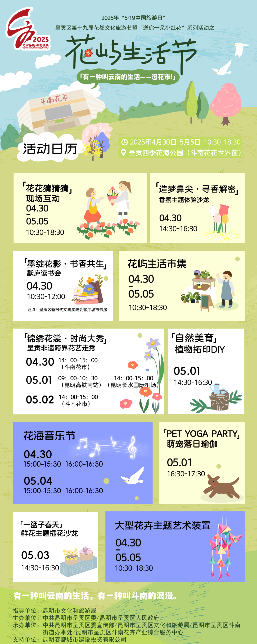 在2025年“5·19中国旅游日”和“五一节”到来之际,结合呈贡区“春城花都展示区、现代科教创新城”定位,通过花屿生活节将花卉元素与休闲生活、文化体验相融合,让大众深入了解花卉种植历史、花语文化,促进花卉文化的传承与传播,增强文化认同感,呈贡区组织开展2025年“5·19中国旅游日”呈贡区第十九届花都文化旅游节暨“送你一朵小红花”系列活动之“花屿生活节”。