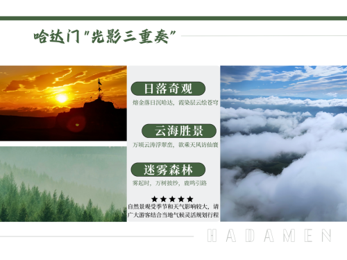 四季光影变化:迷雾森林、云海翻涌、 落日熔金...一步一光影,当游牧的足迹遇见黄昏,哈达门为你定格时光。