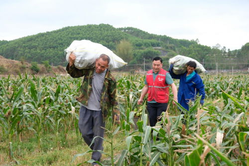 人大代表与驻村第一书记躬行阡陌间,搬运玉米忙。