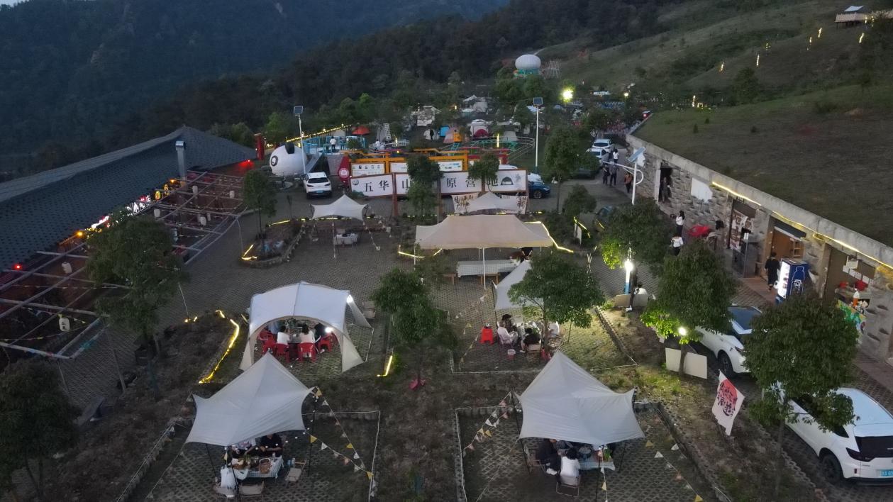 野趣露营,解锁山野夜生活新体验。夜幕降临,五华山的星空营地化作一片光的海洋。游客们在开阔草坪上搭起帐篷,支起烤架,享受“营地烤肉狂欢季”的烟火气。景区引入超燃乐队驻场演出,摇滚与民乐交织的旋律在山谷回荡,露天KTV、篝火晚会等互动环节让现场气氛持续升温。