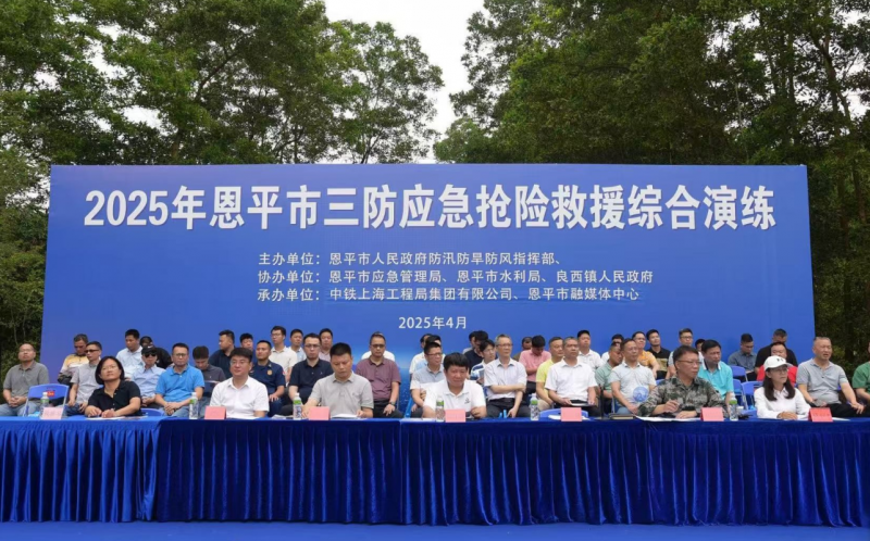 为进一步提高恩平市应对台风、暴雨、洪涝、地质灾害等方面防御和应急救援工作能力,进一步完善三防应急救援体系,最大程度减少人员伤亡和财产损失。由恩平市三防指挥部主办,恩平市应急管理局、恩平市水利局、中铁上海工程局集团有限公司协办,恩平市融媒体中心承办的“2025年恩平市三防应急抢险救援综合演练”活动,于2025年4月29日在恩平市镇海湾区供水工程项目施工现场进行。