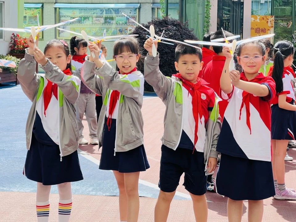 紧接着,航校专业老师们带来的模型表演令人大饱眼福。“哪吒”飞行模型在老师操控下,仿佛从电影中走出,活灵活现地在空中飞舞,孩子们兴奋地跟着音乐哼唱起来。装配紫色彩带的飞机模型也不甘示弱,它在天空中自由翱翔,彩带在蓝天映衬下格外夺目,引得孩子们阵阵惊呼,现场充满了惊叹与欢笑。
