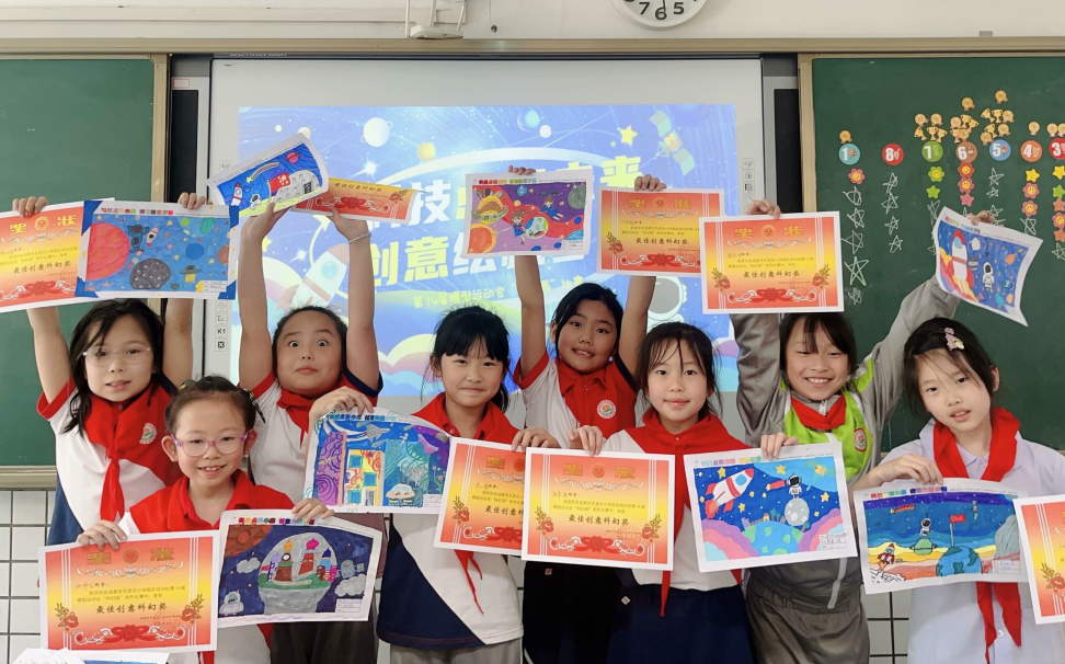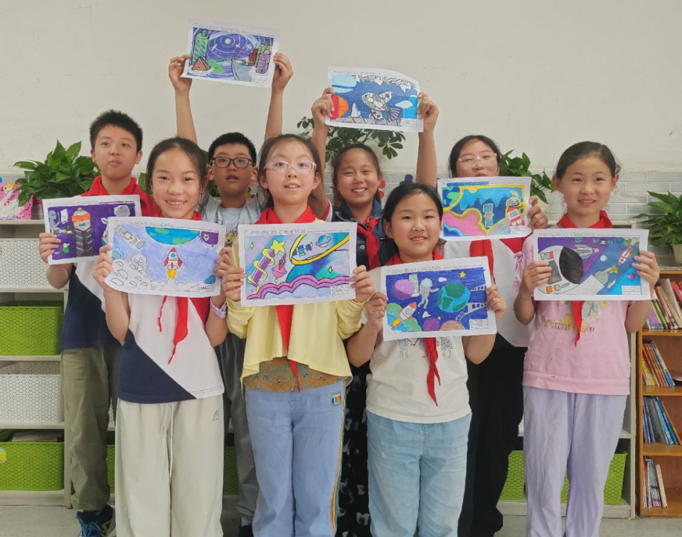 除了精彩的模型比赛,本次运动会还设置了科幻画比赛。昭小娃们在画纸上尽情挥洒创意,一幅幅充满奇思妙想的科幻作品不断呈现。从星际旅行的飞船到未来城市的奇幻景观,从智能机器人的生活场景到神秘的外星生物,这些作品不仅展示了同学们天马行空的想象力和创造力,还激发了他们对科学未来的深入思考与探索热情。