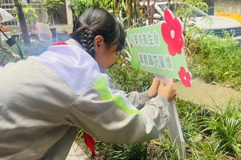 劳动教育不仅局限于校园,更延伸到了社区。在劳动周的社区志愿服务中,昭小娃们化身“社区小管家”,用实际行动诠释劳动之美。他们俯身草地,拔除杂草、翻整土地,亲手种下各色花苗,为社区增添盎然生机。孩子们拿起画笔,在画板上绘制可爱图案与环保标语,制作成保护花草的标志牌,插在花坛边,以童趣的方式传递绿色理念。