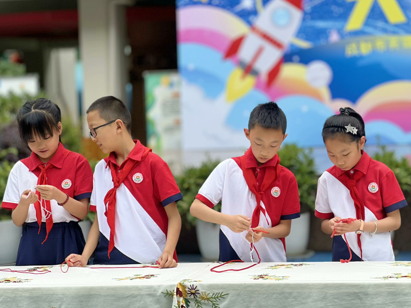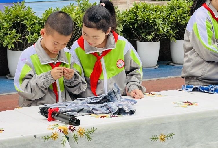 低年级的萌娃们化身“收纳小专家”,将衣裤叠得整整齐齐,每一个动作都力求规范,小小的身影背后是对生活的热爱和对细节的关注。中年级的同学们则在穿针引线、缝纽扣的项目中全神贯注,他们屏气凝神,动作娴熟,缝纽扣的手法有模有样,仿佛一个个小小的裁缝师傅。而高年级的同学们更是挑战了麻绳技艺,灵活运用绳结技法编织中国结,指尖翻飞间,传统技艺焕发出新的生机,也展现了孩子们对传统文化的热爱与传承。