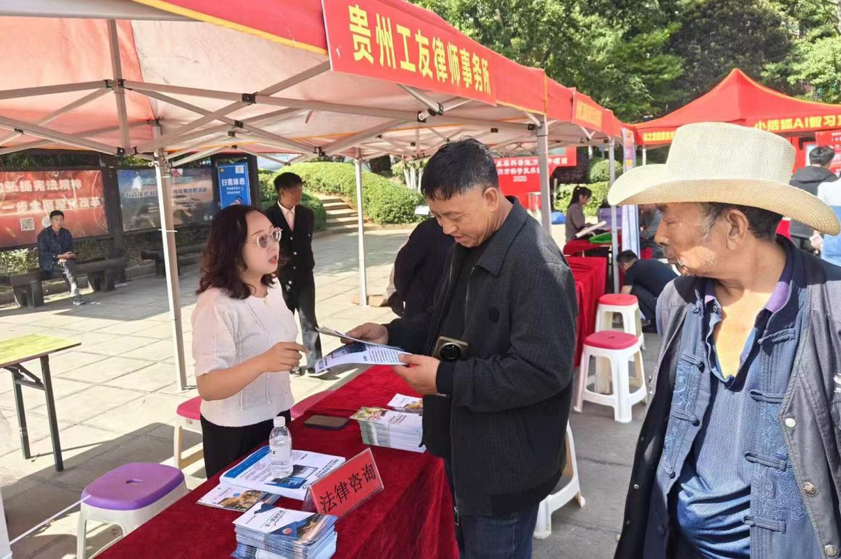 活动现场,律师以劳动者权益保护为核心,将《中华人民共和国劳动合同法》《中华人民共和国工伤保险条例》《保障农民工工资支付条例》等法律知识送到群众身边,重点解读试用期权益、社保缴纳、工伤赔偿等高频问题,累计发放宣传资料200余份,接待咨询50余人次。针对民营企业普遍关心的合同管理、劳务纠纷等问题,律师结合盘州市人民法院近年审理的工伤赔偿典型案例以案释法,引导企业完善内部合规制度。在劳动者咨询区,律师重点解答了“未签订劳动合同如何维权”“欠薪追讨途径”等热点问题.