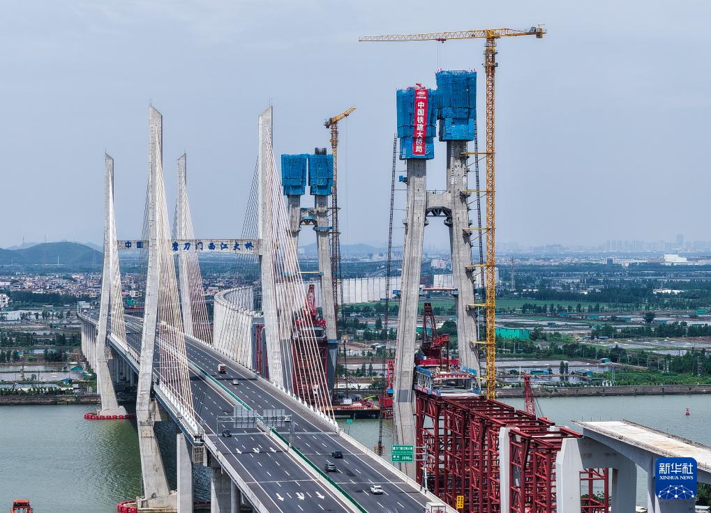 5月11日,深江铁路跨磨刀门水道主桥东主塔(右一)封顶(无人机照片)。