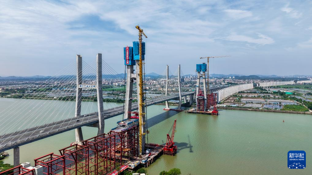 5月11日,深江铁路跨磨刀门水道主桥东主塔(左二)封顶(无人机照片)。