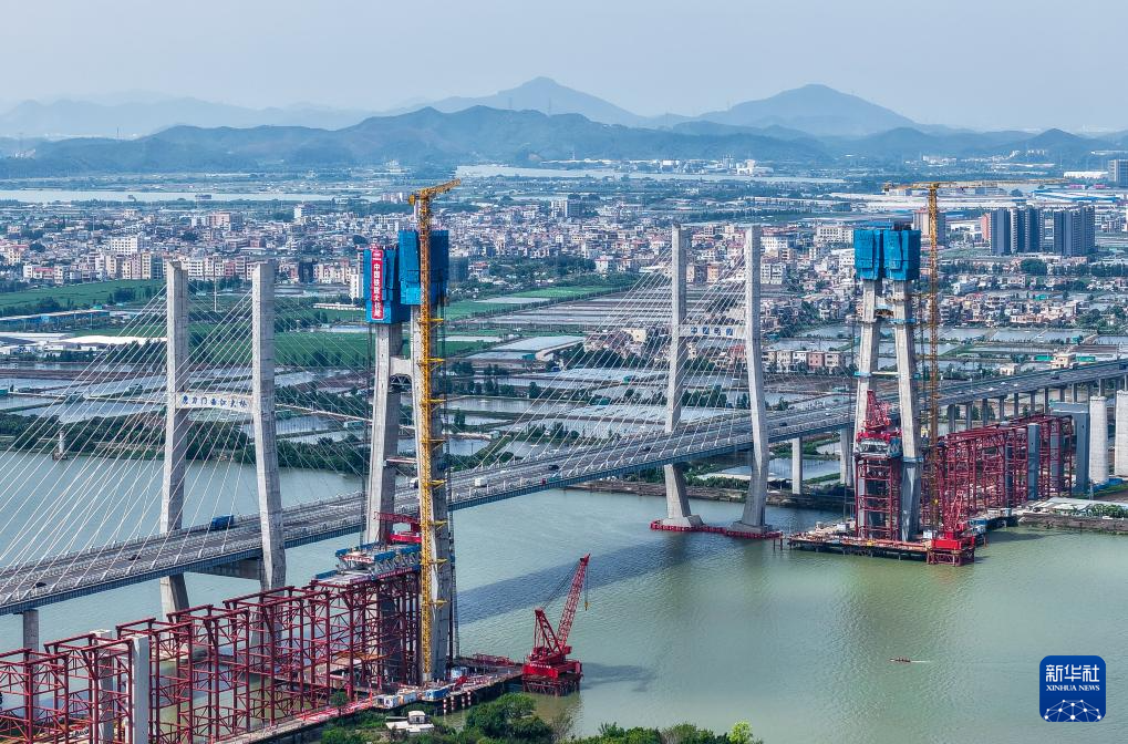 5月11日,深江铁路跨磨刀门水道主桥东主塔(左二)封顶(无人机照片)。