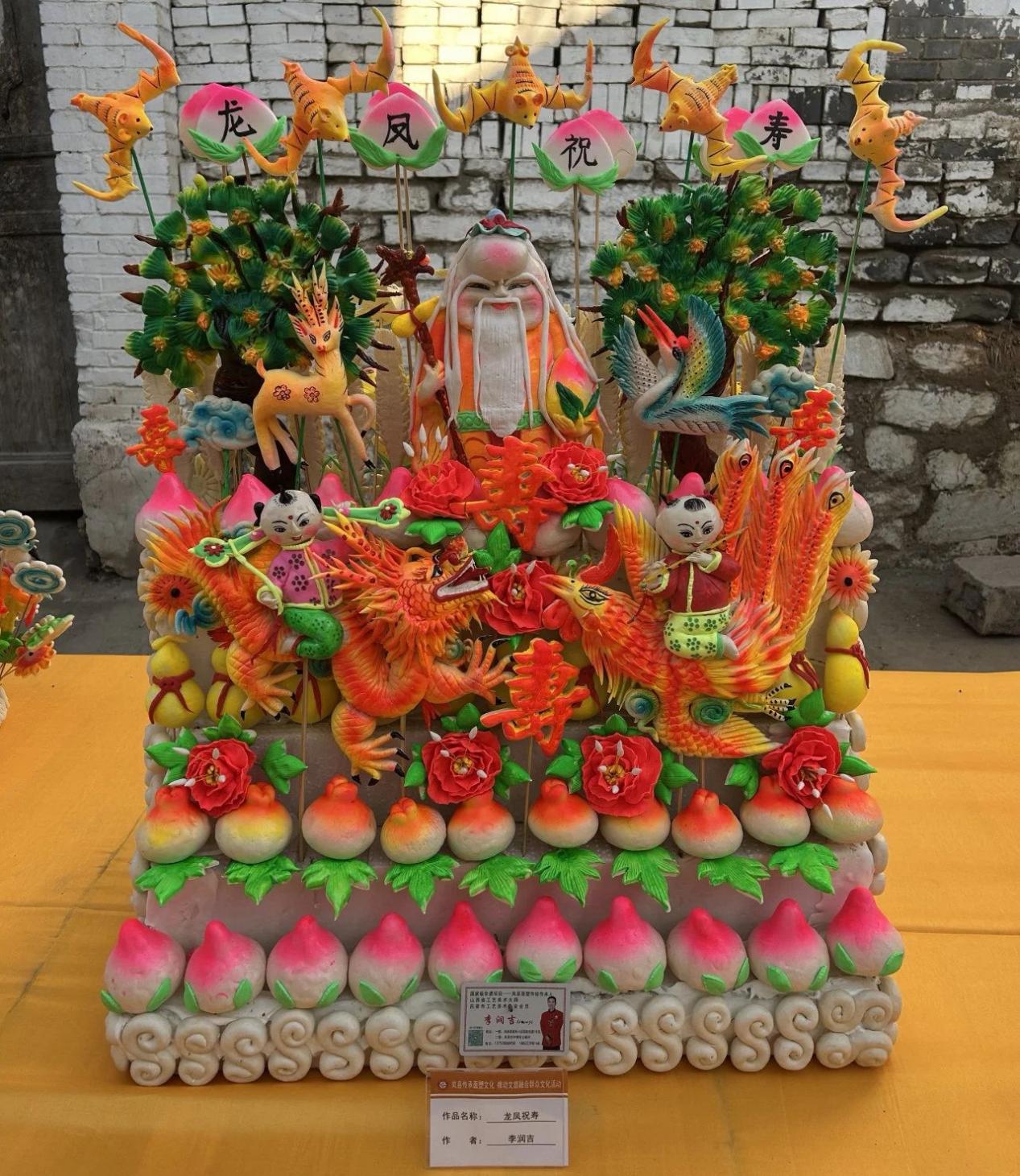 面塑,俗称“捏面人”“面花”“礼馍”等,是中国民间传统手工艺术的表现形式之一,它以糯米粉、面粉为主要原料,辅以甘油或澄面等材料调制成面团,通过揉、捏、搓、压等手法,借助剪刀、梳子、竹签、切刀、筷子等工具进行细节刻画,再以色彩描绘,最终塑造出花草树木、人物动物、龙凤神兽等栩栩如生的形象,成为婚礼、节庆、祭祀等民俗用品。