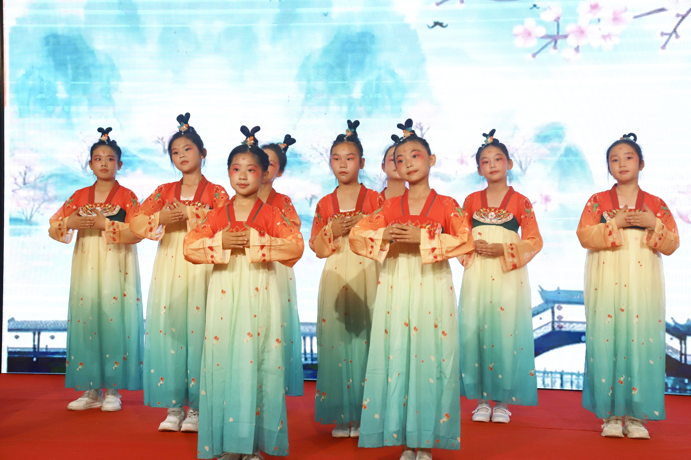 在暖场环节,三(1)班的《我乃哪吒三太子》戏剧表演,以经典神话故事为蓝本,传递中华优秀传统文化中的奋斗精神;一(3)班腰鼓表演《小腰鼓》气势磅礴,展现传统艺术的独特魅力;音乐社团的手势舞《礼仪之邦》将古典雅韵与现代艺术形式相结合,弘扬中华礼仪文化;啦啦操社团活力四射的表演,彰显新时代青少年昂扬向上的精神风貌。