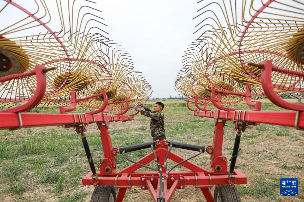 5月13日,农机技术人员在河南省平顶山市宝丰县闹店镇检修搂草机,为麦收做准备。
