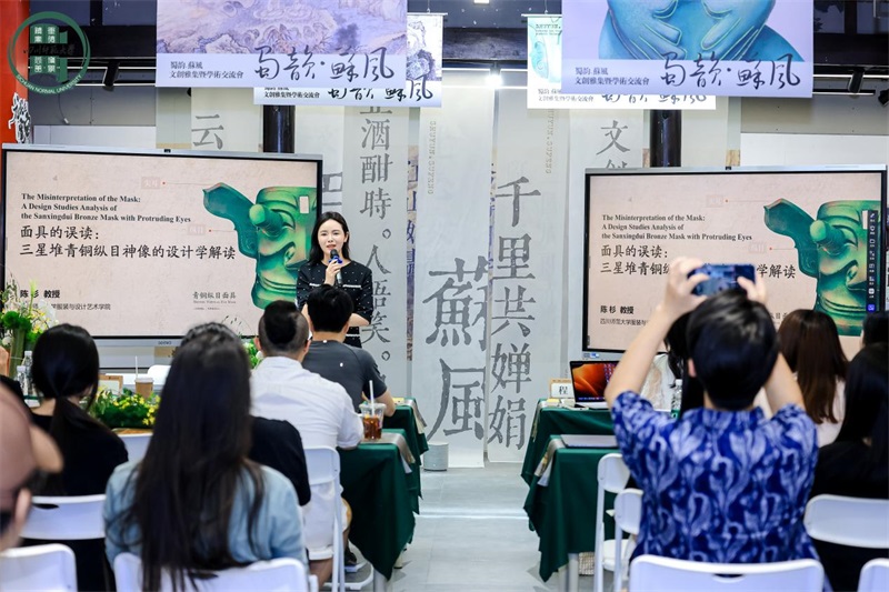 湖南大学设计艺术学院院长、长江特聘教授季铁以《全球化、智能化引领的非物质文化遗产创新生态体系建构》为题,介绍了建构非遗手工艺的生态视域,并分析了数智时代非遗手工艺文化创新生态的发展特征与趋势。四川师范大学服装与设计艺术学院院长陈杉则聚焦三星堆标志性文物——青铜纵目面具,带来《面具的误读:三星堆青铜纵面神像的设计学解读》的精彩分享,为古蜀神权及早期文明神性表达研究提供新视角。四川师范大学服装与设计艺术学院产品设计(中外合作办学)系主任程思副教授在学术论坛上,以《三星堆青铜艺术数字资源体系建构及智能设计》为题,分享了其在文化遗产数字化保护领域的前沿研究成果。四川师范大学服装与设计艺术学院教师罗瑶以《三星堆铸造技术的奥秘》为题,深入探讨三星堆文明的发展脉络与工艺精髓。