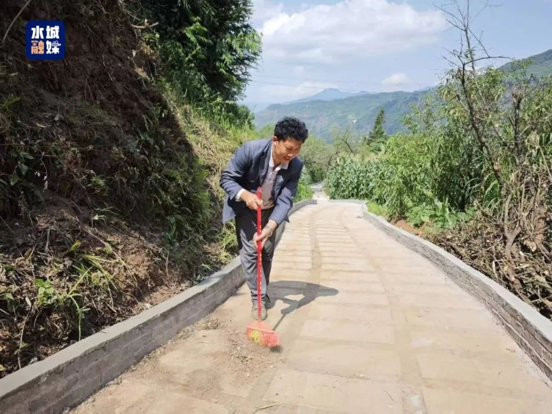 村民自觉清扫乡间串户路上的垃圾。何梅 摄