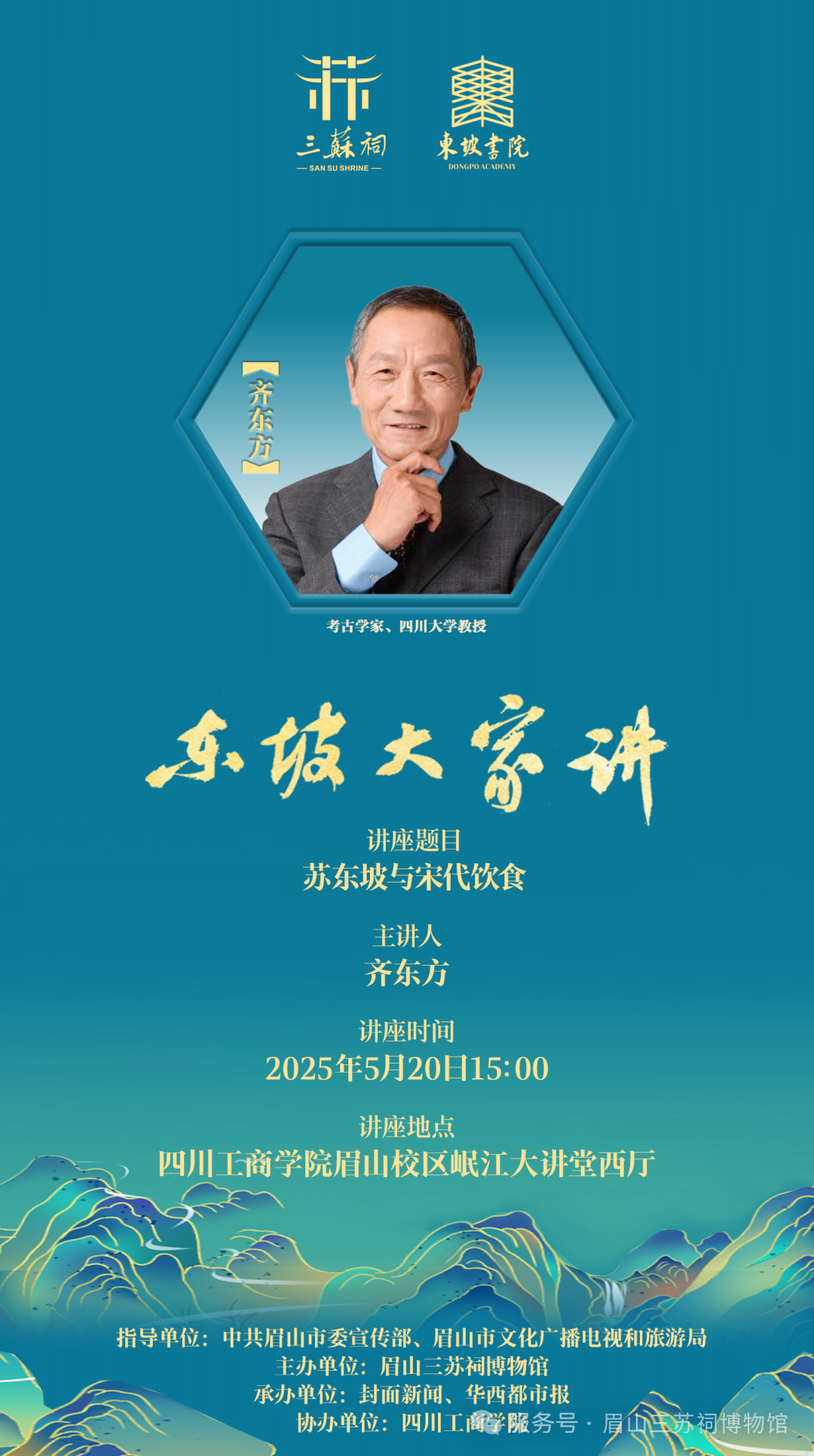 5月20日,“东坡大家讲”系列讲座将再次上新。本期讲座特别邀请到著名考古学家、四川大学教授齐东方,为大家分享《苏东坡与宋代饮食》。他将以考古学的独特视角,从苏东坡的美食人生切入,通过出土文物、文献典籍与苏轼诗文互证,揭开宋代饮食文化的鲜活图景。