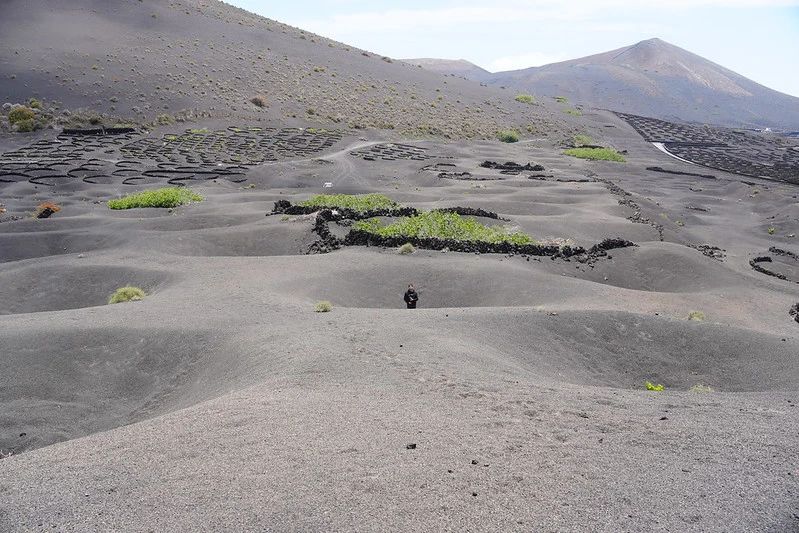 在加那利群岛中的兰萨罗特岛上,黑色的火山干旱地貌宛如月球表面。此地海风常年不止,农民因地制宜,创新挖掘当地土壤潜力,创造出独特而壮观的农业体系。在18世纪,岛上多个火山口持续喷发达6年之久。此后农民就地取材,开始巧妙利用火山砾或熔岩碎片(enarenado)和海沙(jable)吸收水分、调节土壤温度、保护作物。