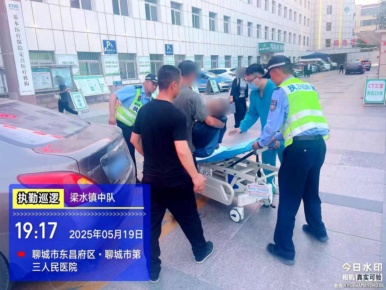 5月19日19时许,东昌府交警大队乡镇巡逻三中队在北环执勤时,遇群众求助:家人昏迷,情况十分危急,急需去聊城市第三人民医院救治,求助执勤交警给予帮助引导。