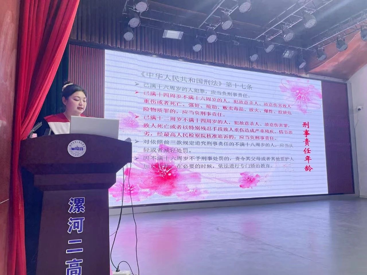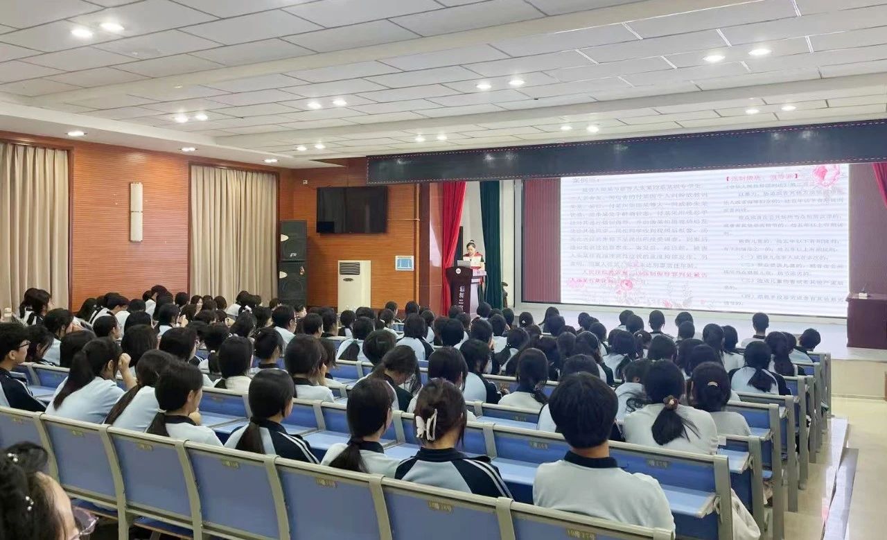 正值第五个“民法典宣传月”,为增强青少年法治意识,护航未成年人健康成长,5月20日,受漯河市第二高级中学邀请,漯河市中级人民法院联合漯河市红十字会走进漯河市第二高级中学,开展以“反诈反欺凌,青春法同行”为主题的法治宣传活动,为全体高一师生带来了一场生动实用的法治教育课。民一庭法官助理蒋丽婷担任本次法治教育课主讲人。