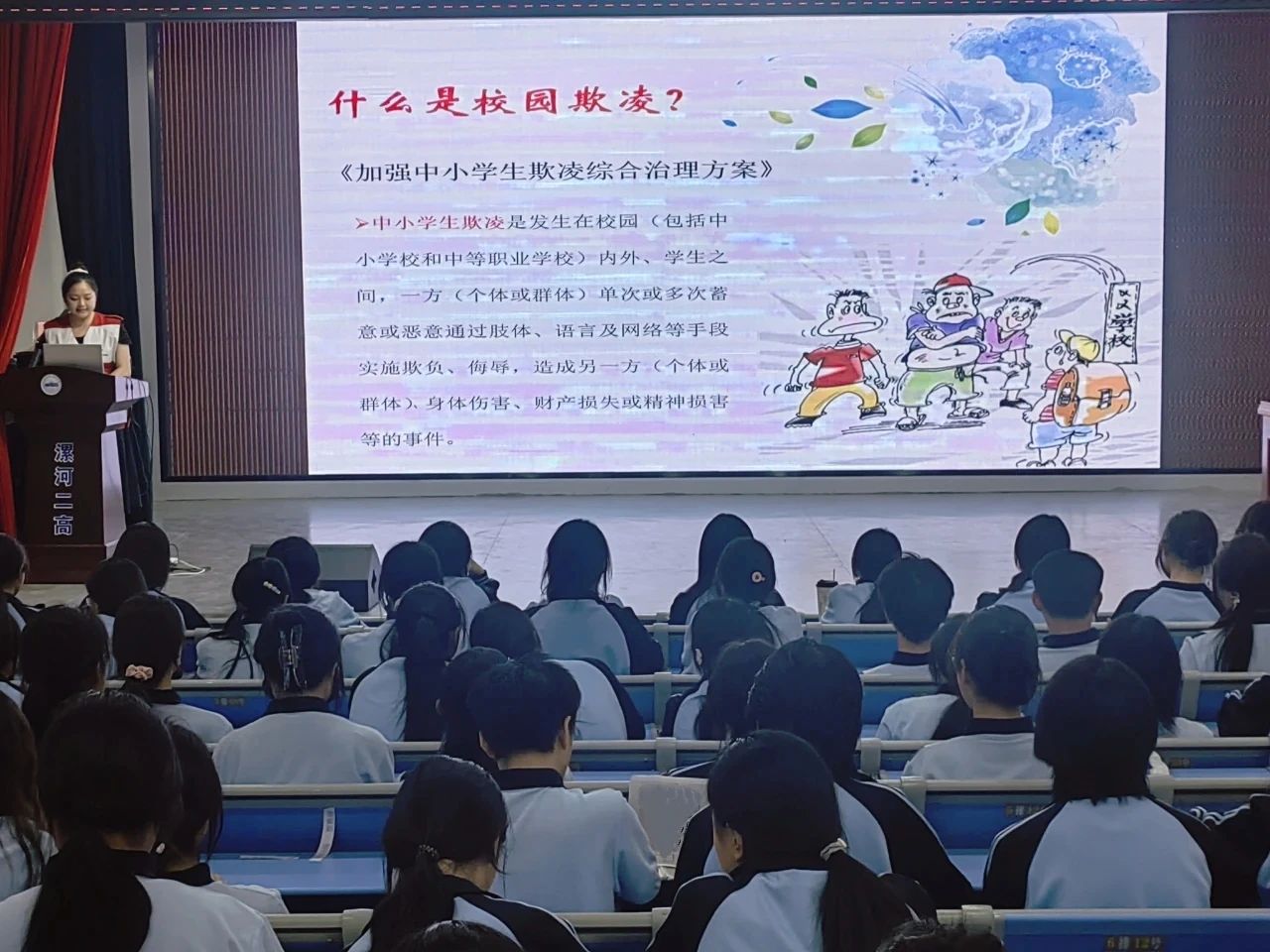 预防校园欺凌。“什么是校园欺凌?校园欺凌有哪些种类?校园欺凌会对青少年造成什么样的影响以及有哪些法律后果?遭遇校园暴力后又该如何保护自己?”主讲人以深入浅出、通俗易懂的语言,结合发生在校园的典型案例,为师生们普及了校园欺凌相关法律知识,从法律角度剖析了校园欺凌的法律后果。通过讲座,让师生们对什么是校园欺凌,校园欺凌危害性和严重后果以及如何运用法律武器来保护自己,让法律成为驱散校园欺凌的坚强后盾有了更为清晰、具体的认识。