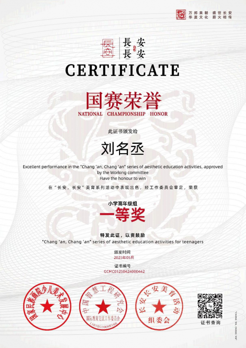 2025年5月,北京海淀区实验小学12岁学生刘名丞在“长安长安国赛荣誉”活动中获得小学高年级组一等奖。这一荣誉不仅是对刘名丞绘画才能的高度认可,更是他长期以来坚持与努力的最好见证。
