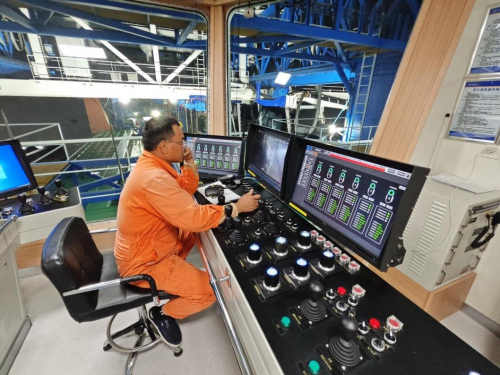 走进“交通建设九号”多功能智能环保铺排船舱体内,核心操作室恍若高科技指挥中心。大屏幕上,可以看到自动锚泊定位、铺排控制系统、机械臂式充灌控制系统相互交互,协同控制完成铺排作业全过程。
