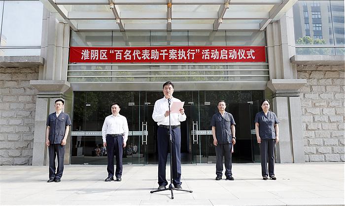 2025年5月21日上午,江苏省淮安市淮阴法院举行“百名代表助千案执行”活动启动仪式,淮阴区人大常委会主任张延峰、淮安市中级法院党组成员、副院长朱介进、执行局局长姚月梅、淮阴法院党组书记、院长刘洋,以及淮阴区人大常委会相关委室同志,淮阴区各镇街人大主席(主任),部分人大代表,淮阴法院全体执行干警参加活动。启动仪式由淮阴区人大常委会副主任汪建军主持。