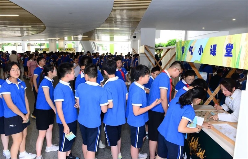 古韵仪式启幕,点燃文化热情。活动在充满传统韵味的节气仪式中拉开帷幕,两名“节气守护者”与身着麦穗纹饰汉服的学生代表共同敲响节气锣,LED屏同步播放麦田生长、蚕宝宝吐丝等动画,生动展现“小满三候”的自然智慧。随着全场齐呼“小满小满,健康满满”的口号,现场气氛热烈,孩子们对中医药文化的兴趣被充分激发。