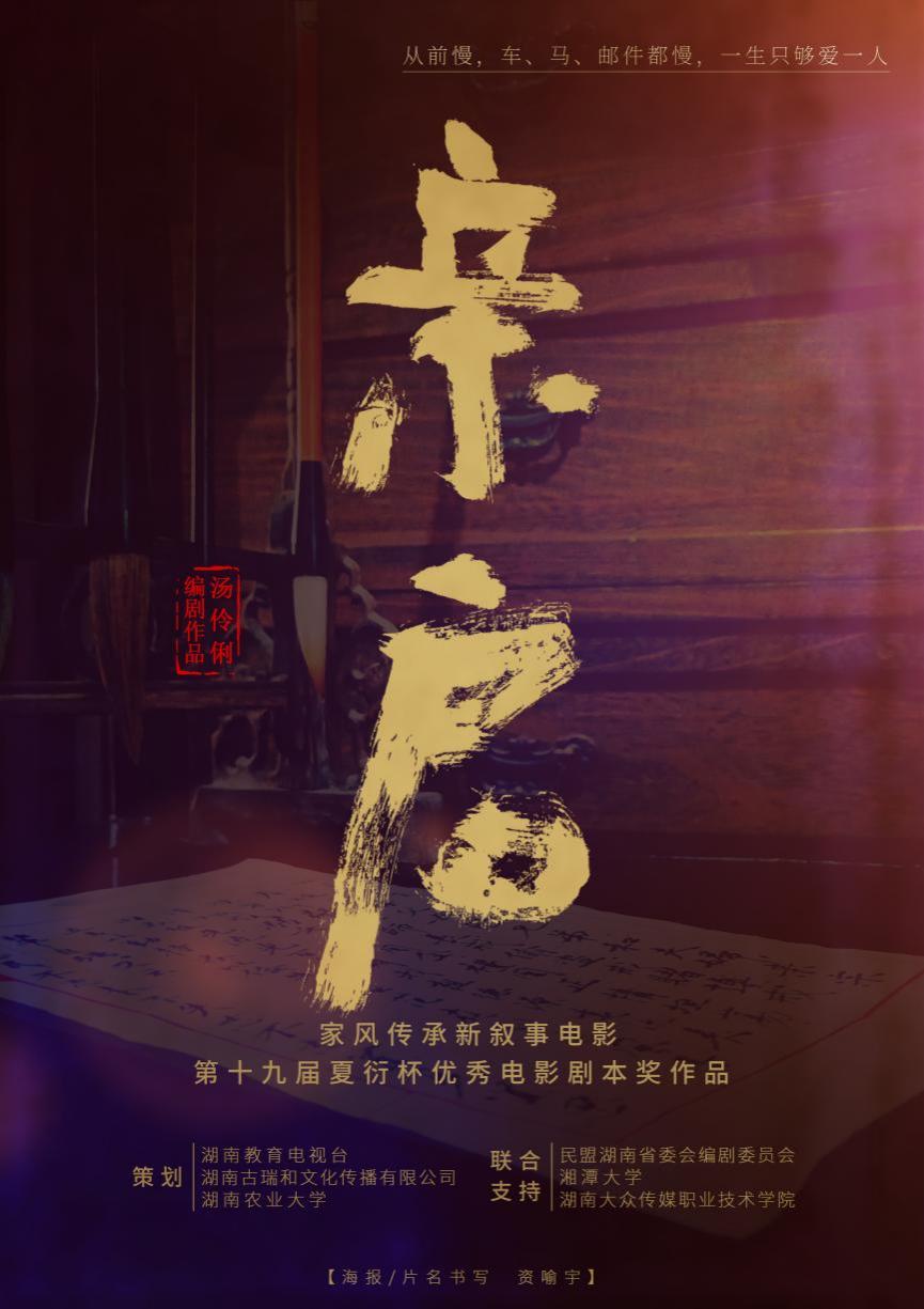 剧本《亲启》由湖南教育电视台、湖南古瑞和文化传播有限公司、湖南农业大学联合策划,创作得到中共湖南省委宣传部电影处、民盟湖南省委会编剧委员会、湘潭大学、湖南大众传媒职业技术学院、湖南省电影行业协会、湖南省网络视听协会等单位指导支持。