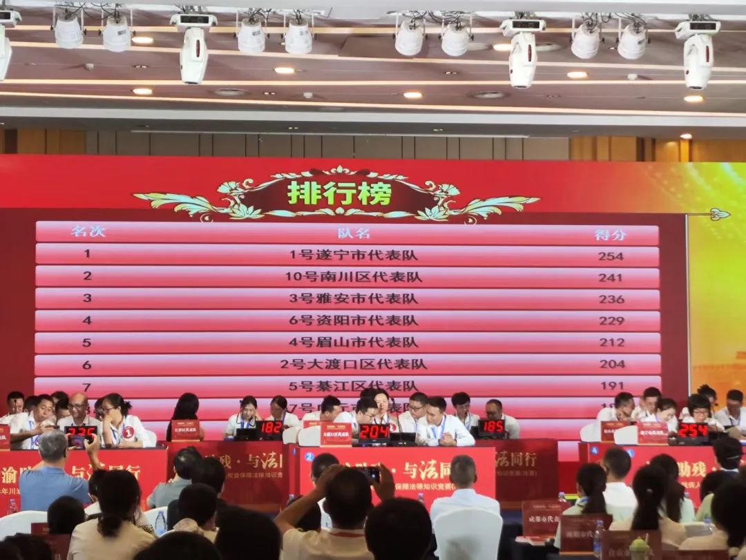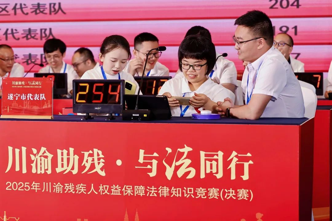 5月23日,由四川省残联和重庆市残联联合主办的"川渝助残·与法同行"2025年残疾人权益保障法律知识竞赛决赛在重庆圆满落幕。遂宁市代表队以总分254分第一名的优异成绩力压群雄,从30支决赛队伍中脱颖而出,勇夺竞赛一等奖。
