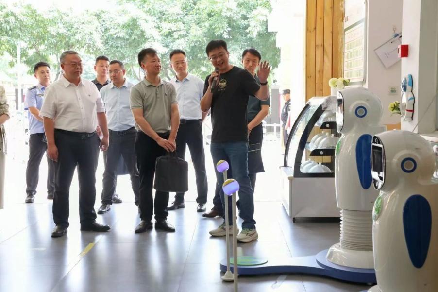 党支部副书记、副园长、食品安全总监简堂永讲解幼儿园的智慧系统,晨检机器人“小诺”每日精准采集幼儿身高、体重、体温等数据,同步传输至营养分析系统,自动生成个性化配餐方案。