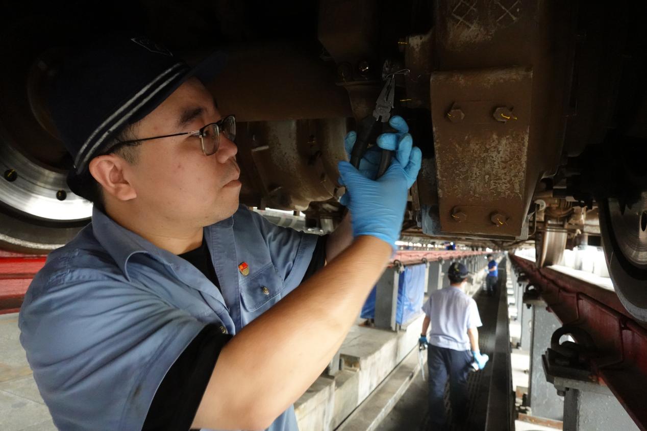 图为动车组机械师对动车组走行部喷涂标记。(邓子圣 摄)