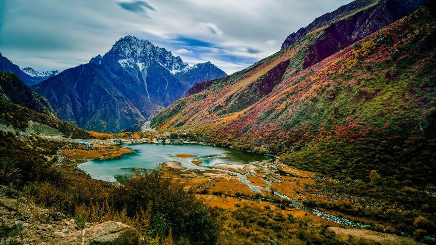 作品简介:(作者自述)此处是山南的达谷峡谷。湛蓝的湖泊坐落于山谷间,周边是五彩斑斓的植被,远处巍峨的雪山在云雾缭绕下若隐若现,共同构成了如诗如画的自然美景。