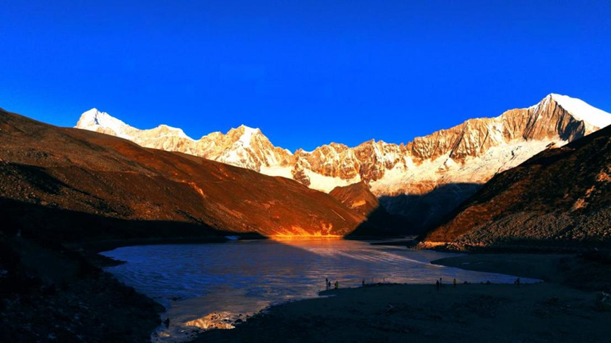 作品简介:画面中,在晨曦的映衬下,远处库拉岗日雪白的山峰与深蓝色的天空交相辉映,山脚下静谧的湖泊倒映着雪山与天空。