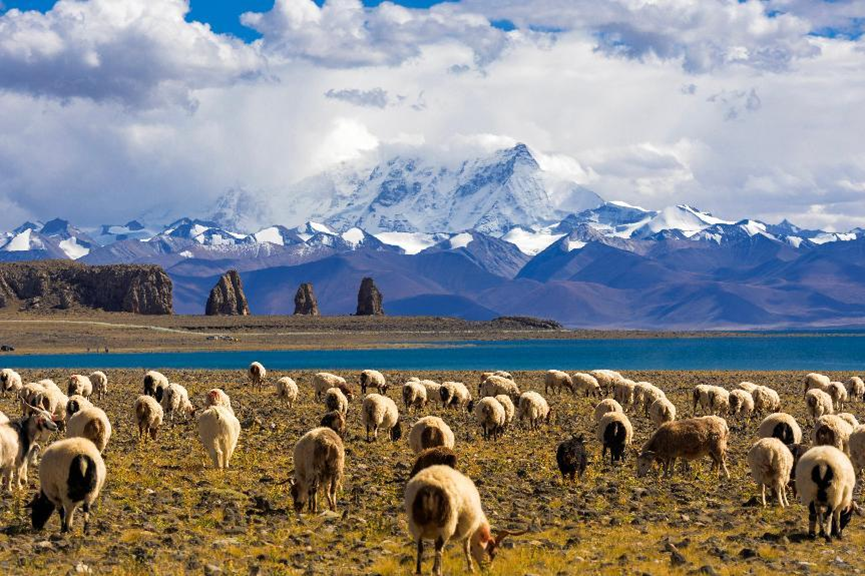 作品简介:(作者自述)图片前景处是悠闲的羊群,远处的念青唐古拉山与纳木错圣象天门景区遥相对望。