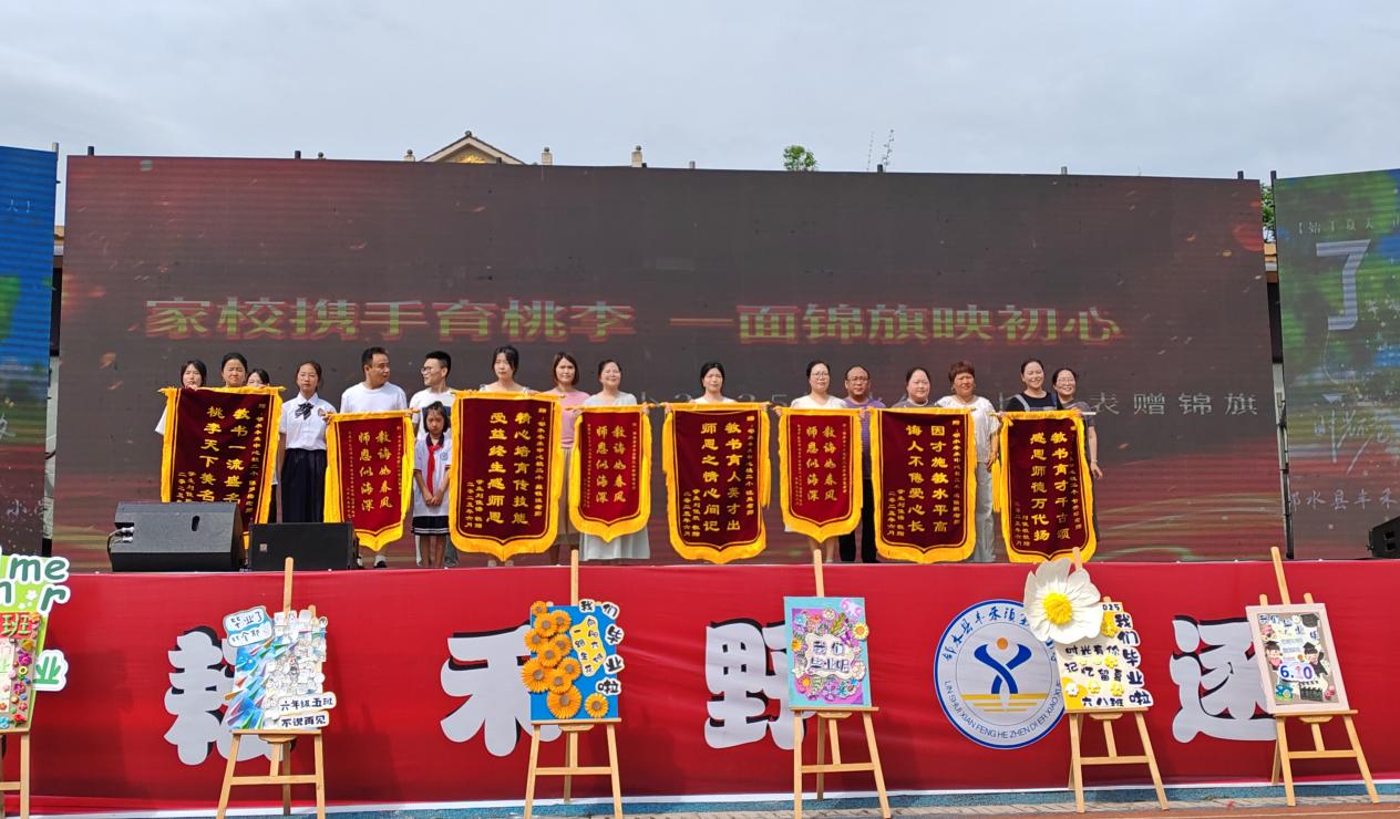 “抽穗感恩”环节,爱意满盈。家长为学校赠送锦旗,致谢育人之恩。随后,当老师们的微视频在大屏幕上缓缓播放,句句暖心语录诉说着师者深情。各班学生代表手捧鲜花,奔向讲台,与老师紧紧相拥。那一刻,千言万语化作泪水与微笑,师生携手走下舞台,将这份深厚情谊永远定格。