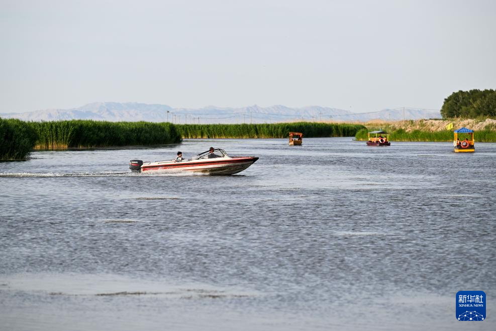 6月4日,游客乘船游览乌梁素海。