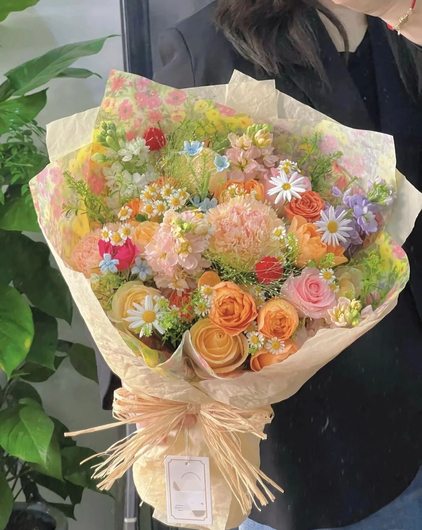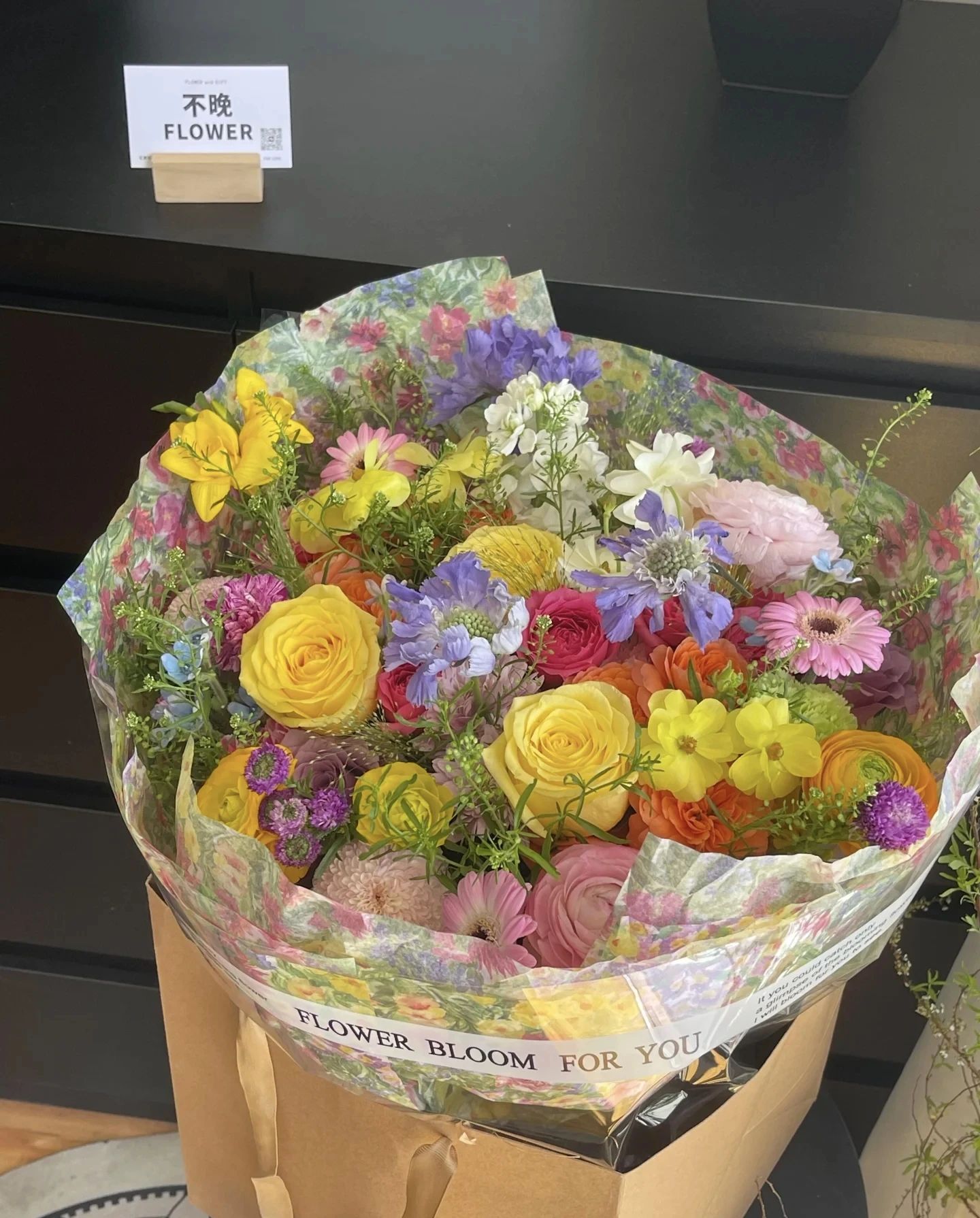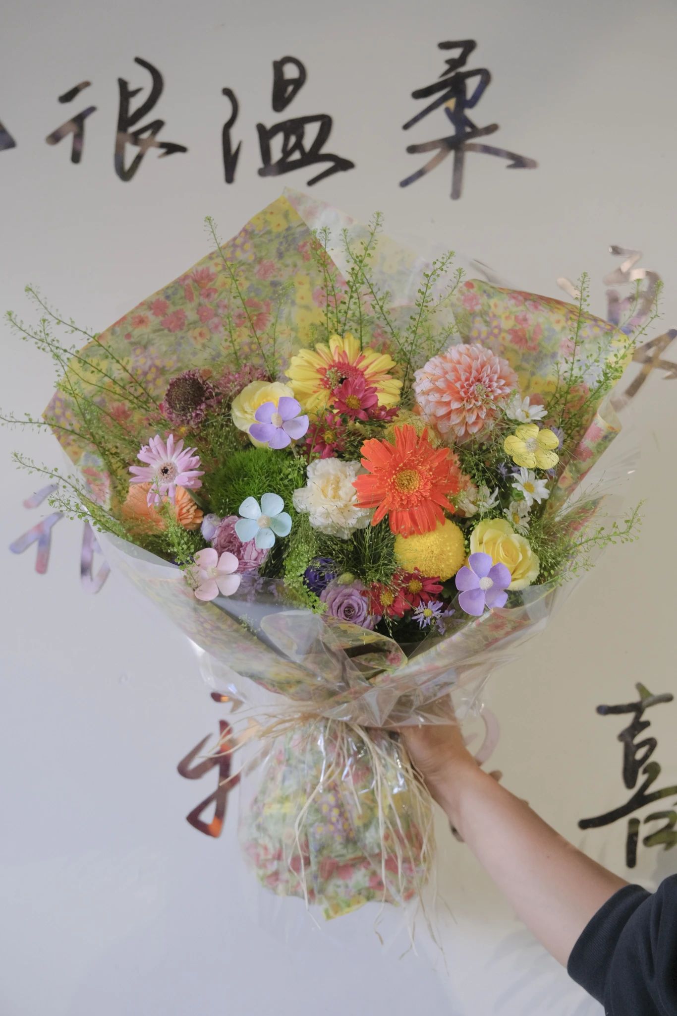 花忆美学花店的白店长今年还设计了一款名为“青春无极限”的花束。用非洲菊的灿烂、大丽花的热情、康乃馨的温馨,搭配蓝星花的灵动与喷泉草的飘逸,十余种花材以田园风包装纸包裹,成就了五颜六色的“青春无极限”。“青春本就是五彩斑斓的,愿高考学子们无畏挑战,绽放最美的自己!”白店长说。