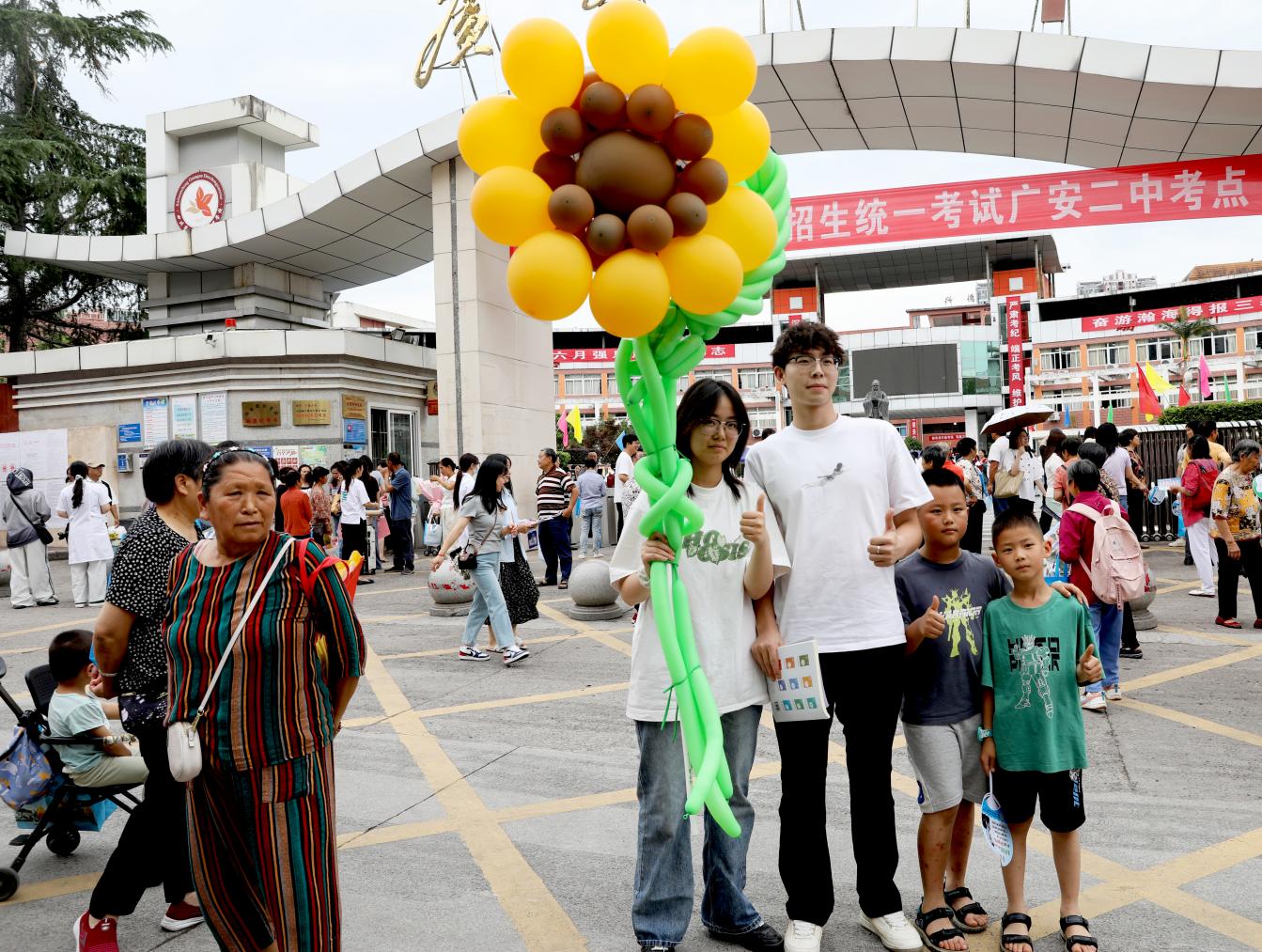 6月9日下午,在四川省广安市广安区广安二中高考考点,哥哥、弟弟向结束高考走出考场的考生送上用气球亲手做的“向日葵”后合影。