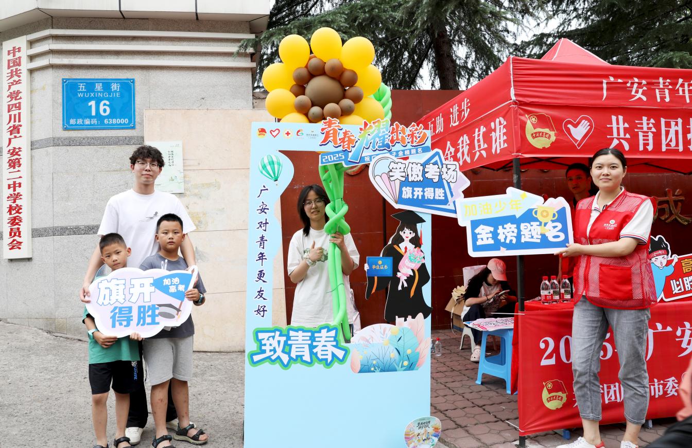6月9日下午,在四川省广安市广安区广安二中高考考点,哥哥、弟弟向结束高考走出考场的考生送上用气球亲手做的“向日葵”后在高考励志墙前打卡。(广安区融媒体中心/廖小兵)