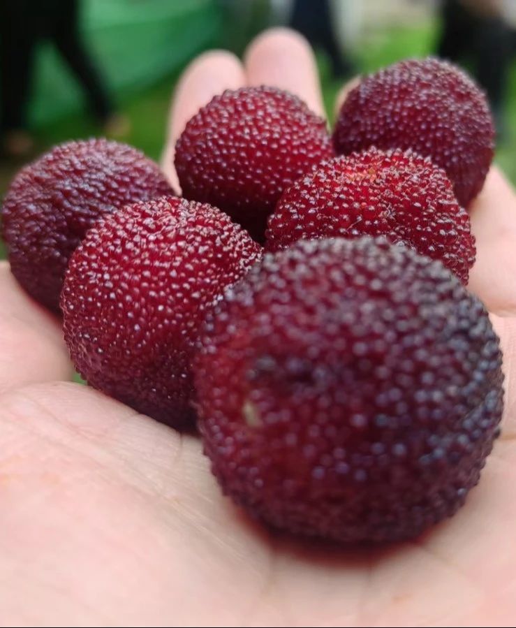 居民们三两结伴,穿梭在枝叶繁茂的杨梅树下。有人踮起脚尖,用竹竿轻轻敲打枝桠,熟透的杨梅便如红雨般簌簌落入纱网;有人小心翼翼地托住枝条,将最饱满的果实摘入篮中,动作轻柔得像是在呵护珍宝。孩子们穿梭其中,眼睛瞪得溜圆,时不时发出惊喜的欢呼:“快来看!这里藏着一颗超大的‘杨梅王’!” 老人们则笑着分享采摘诀窍,“要挑那些果柄鲜绿、果面有白霜的,这样的杨梅最甜!”阵阵欢笑声随着清风在林间荡漾,展现出一幅温馨的邻里互动画卷。