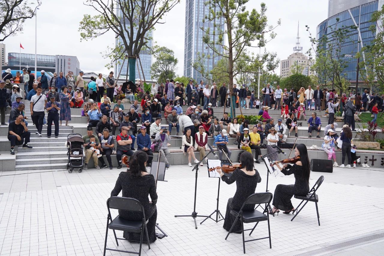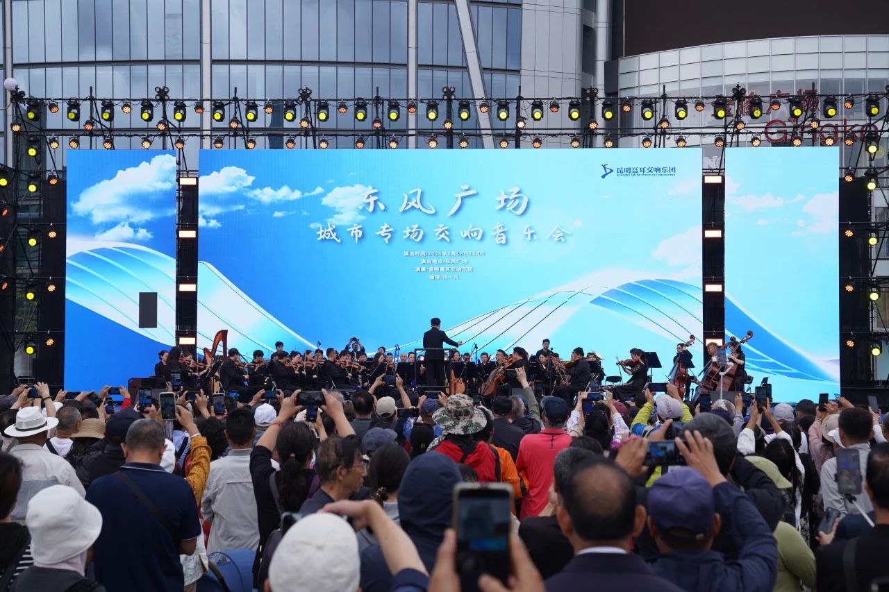 当天上午,古典音乐演奏在滨江亲水平台上演,弦乐器或清亮、或醇厚,一高一低,一疾一徐,让古典作品的生命力在广场上鲜活绽放,悠扬和谐的旋律吸引了众多市民驻足欣赏;在主舞台,昆明聂耳交响乐团带来了“东风广场城市专场交响音乐会”,以城市之名携手经典名作,为现场市民献上典雅恢弘的交响乐章。
