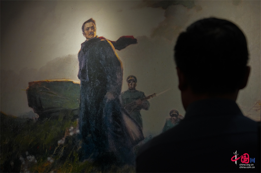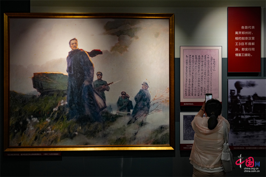 ▲观众参观长辛店二七纪念馆“北方的红星”展览(左侧画作为《1323年2月5日,中国早期工人运动的杰出领导人、“二七”烈士施洋,在武汉洪山刑场英勇就义》)。中国网记者 郑伟 摄