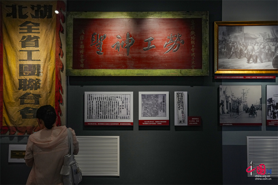 ▲观众参观长辛店二七纪念馆“北方的红星”展览(图中红色牌匾题有“劳工神圣”四字)。中国网记者 郑伟 摄