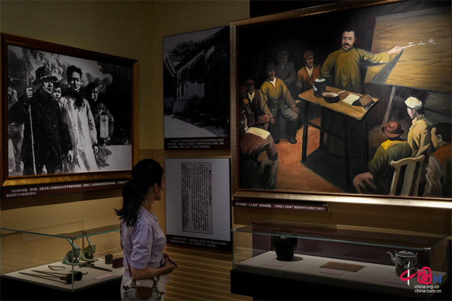 ▲观众参观长辛店二七纪念馆“北方的红星”展览(右上图为《李大钊宣扬“工人是天”的革命真理》)。中国网记者 郑伟 摄