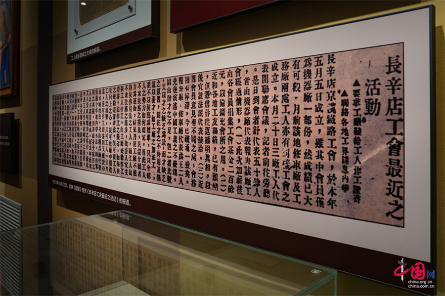▲长辛店二七纪念馆“北方的红星”展品:1921年10月22日,北京《晨报》有关《长辛店工会最近之活动》的报道。中国网记者 郑伟 摄
