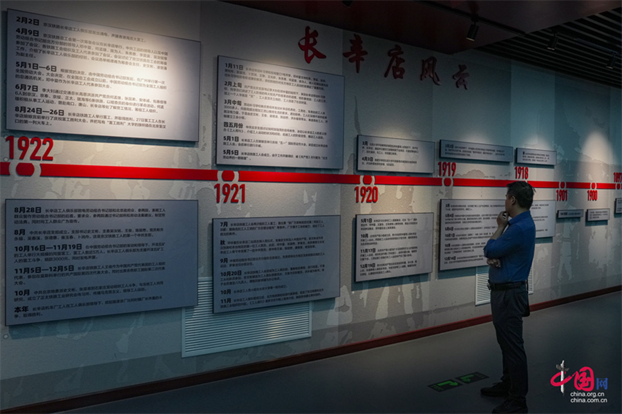 ▲观众参观长辛店二七纪念馆“北方的红星”展览(墙上为“长辛店风云”历史事件时间轴)。中国网记者 郑伟 摄
