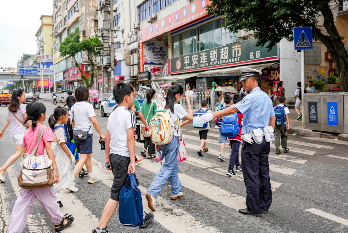 2025年6月20日,四川省华蓥市公安局交通警察大队设于双河小学“护校岗”的民警,在护送上学的学生快速通过斑马线。