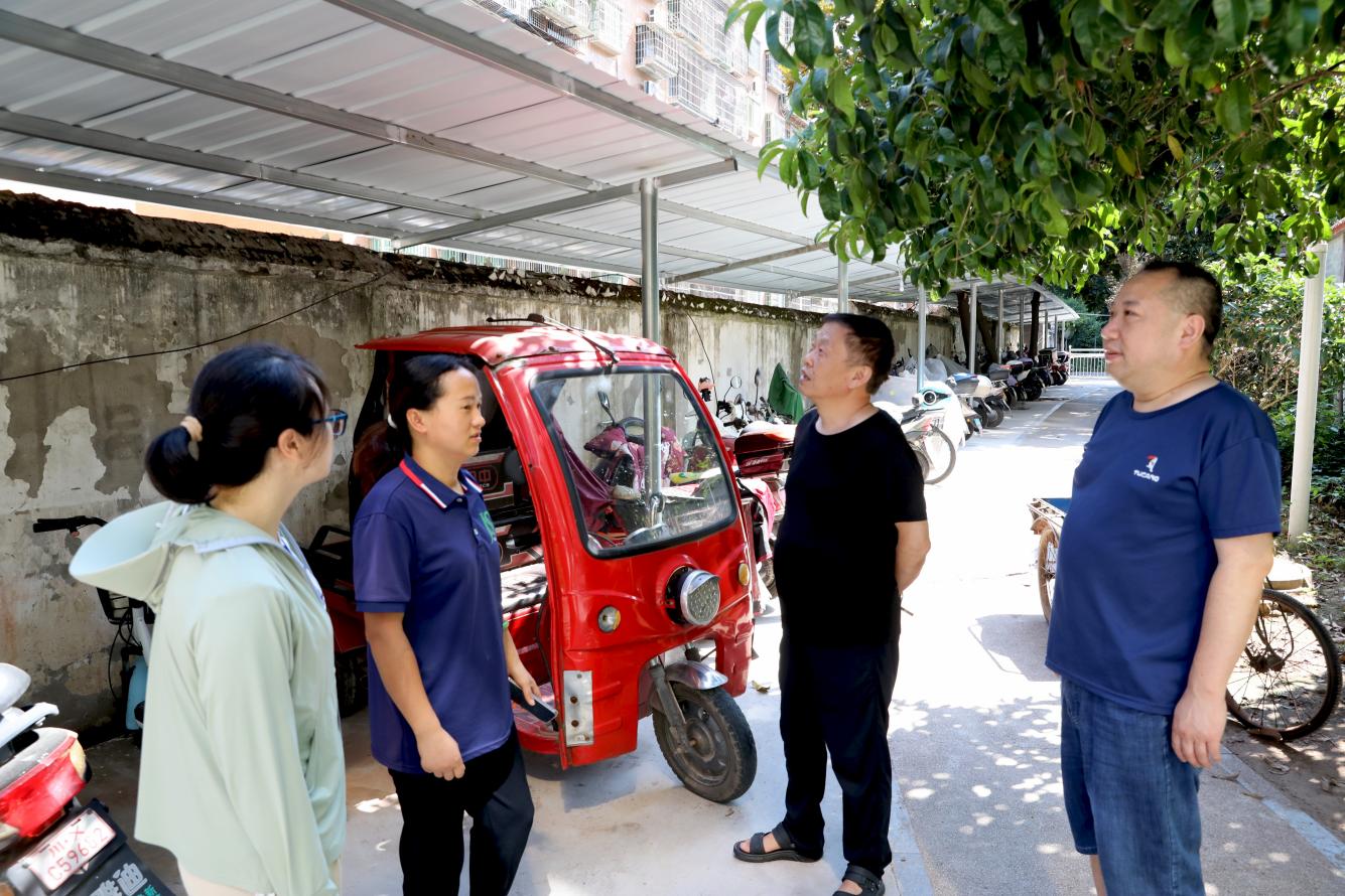 6月23日,广安区中桥街道纪工委书记杨柳(右一)在中桥街道莲塘湾社区华阳东方小区回访充电遮雨棚实事办理情况。