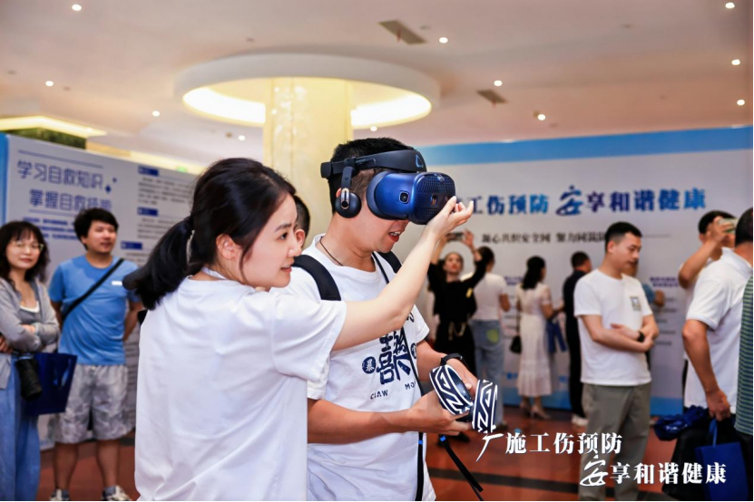 部署会现场精心布置防护体验场,划分“事故警示场”“VR模拟场”“防护体验营”等五大功能区域,打造全链条沉浸式教育场景。参会人员佩戴醉酒模拟设备感受失衡危险,通过VR技术亲历高处坠落瞬间,在专业指导下完成心肺复苏、灭火器材操作等实操体验,在“沉浸式互动+实操体验”中深度感知安全生产的每个细节都关乎生命,深化工伤预防意识,将理论知识转化为实战能力。